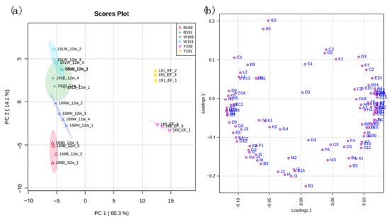 (a) Score plot and (b) loading plot of principal component analysis using the detected volatiles as the variables. Y191 and Y169 represent wine made of clone 191 and 169 before aging, respectively. W191 and W169 represent wine made of clone 191 and 169 aged in Wolin oak barrel for 12 months, respectively. B191 and B169 represent wine made of clone 191 and 169 aged in Bordeaux oak barrel for 12 months, respectively. The codes of volatile compounds in the loading plot refer to Table S1.