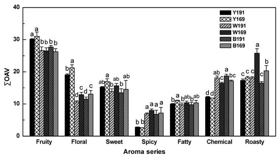 Total odor activity values of aroma series in wine made of Cabernet Sauvignon clone 169 and 191 before and after aging process. Y191 and Y169 represent wine made of clone 191 and 169 before aging, respectively. W191 and W169 represent wine made of clone 191 and 169 aged in Wolin oak barrel for 12 months, respectively. B191 and B169 represent wine made of clone 191 and 169 aged in Bordeaux oak barrel for 12 months, respectively. Different letters indicate significant differences between samples for each aroma attribute at a significant level of 0.05.