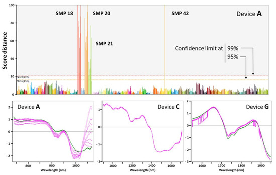 Upper panel: Score distance of the original skimmed milk powder (SMP) samples in a SIMCA model of spectra recorded on device A (the 70 SMP samples are color coded with all replicates, n = 10, in the same shade). Lower panel: Typical spectral abnormalities observed in devices A, C, and G (normal spectra are green-colored while samples with atypical profiles are in magenta).