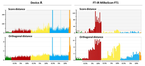 Regarding the exceptions mentioned earlier, the wet-blended set recorded with device D shows an apparent response dependence with the concentration of ammonium sulfate (Figure 3). It is important to underline that this dependence is most noticeable on the score distance (upper panel) instead of the residuals (lower panel), opposite to what is expected for spectral information absent in the modelled population. We obtained a similar pattern with sensor of device F (data not shown). This result was observed mostly for the wet-blended set of samples and later confirmed exclusively for ammonium sulfate. Considering that this dependence is most evident on the score distance, it suggests that the response to this adulterant is indirect [29,30], i.e., resulting from changes to major milk properties caused by the ammonium sulfate upon dissolution, and probably further manifested after spray drying.