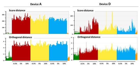 Both, the score distance (SD or Hotelling’s T2) and the orthogonal distance (OD) were calculated for each sample according to Equations (1) and (2), respectively. The score distance, SD, or in-model distance, is in this case equivalent to the square Mahalanobis distance: