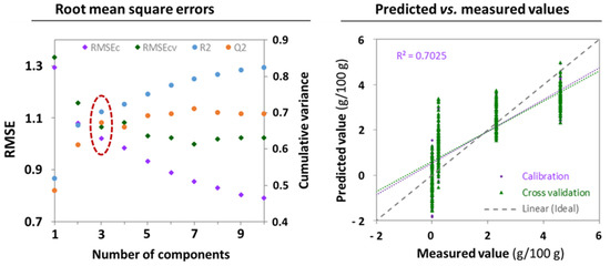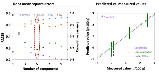 Optimal model size was determined by the number of components at which the RMSEcv stabilized around its averaged minimum, while differing by less than 30% from the RMSEc.