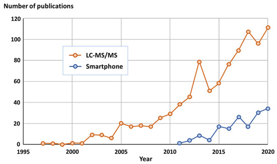 Yearly-based number of publications returned with keywords ‘Food’ and ‘Safety’ in combination with either ‘Smartphone’ or ‘LC-MS/MS’ (LC-MS/MS stands for liquid chromatography-tandem mass spectrometry) on the literature search platform Scopus (www.scopus.com accessed on 15 October 2021).
