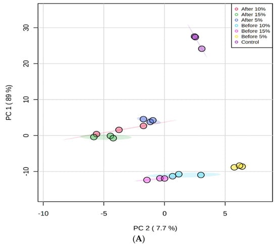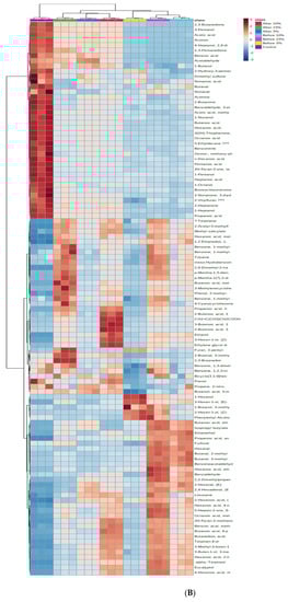 The effects of fortification were further analysed by principal component analysis (PCA) and presented as the PCA plot and heatmap in Figure 1A,B, respectively. The separation of control and tamarillo yoghurts based on the volatile profile was clearly visible. Principal component (PC) 1 and PC 2 explained 89% and 7.7% of the variance, respectively, and therefore, no further PCs were considered. For PC1, the control sample was located on the positive region, whereas all of POS were around the zero line and all of PRE fell in the negative region. For PC2, the control was located in the positive region, whereas all POS were located in the negative area. PRE, PRE5, and PRE10 were in the positive area but PRE15 fell in the negative region. PC2 completely resolved the fortified yoghurt samples based on the tamarillo concentration regardless of fermentation process. The 5% samples were on the far right side, the 15% samples were located on the left side, and the 10% samples fell in between the 5% and 15% samples. A heatmap was generated to visualise the relative abundance of volatiles in each yoghurt group. Overall, clear differences were observed between control, PRE, and POS yoghurt samples.