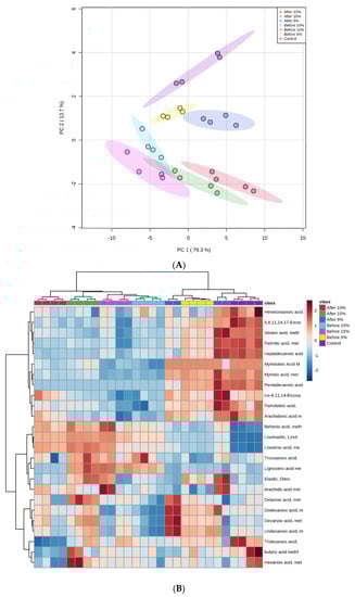 The PCA plot and heatmap were used to determine the effects of the addition of tamarillo powder, as shown in Figure 2A,B, respectively. The control and tamarillo yoghurt samples were almost perfectly resolved on PC1, which explained 79.3% of the variance in the data, and on PC2, which explained another 13.7% of the variance. Therefore, no further PCs were considered. PC1 mostly resolved the difference in tamarillo yoghurts between PRE and POS. For PC1, all of PRE fell in the negative region, whereas most of POS was located on the positive region, except for two samples of POS15. Two samples of the control yoghurt fell in the negative region and the other two were located in the opposite region. For PC2, the control, PRE5, and POS5 were located in the positive region. PRE10, POS10, PRE15, and POS15 were in the negative area, except for one sample of PRE10. The PC2 also completely resolved the samples based on the tamarillo concentration regardless of the fermentation process. The heatmap cluster analysis of these 37 fatty acids showed a clear separation between control and fortified yoghurts. Separation among tamarillo yoghurts based on the concentration of tamarillo added was also observed. The PRE5 and POS5 were more closely related to the control than the others. On the other side, PRE10 and PRE15 were in the same cluster, which was separated from the POS10 and POS15 cluster.