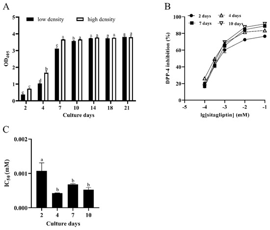 Characterization of DPP-4 activity in Caco-2 cells. (A) Effects of culture time and seeding density on the DPP-4 activity in Caco-2 cells. Different letters (a–e) on the column with the same color indicate significant differences (p < 0.05). (B) Effects of sitagliptin on DPP-4 activity in Caco-2 cells. (C) IC50 value of sitagliptin inhibiting DPP-4 at different culture days. Different letters (a,b) indicate significant differences (p < 0.05). Each value represents the mean ± standard deviation (n = 3). Note, low density, 1 × 105 cells/mL; high density, 7 × 105 cells/mL.