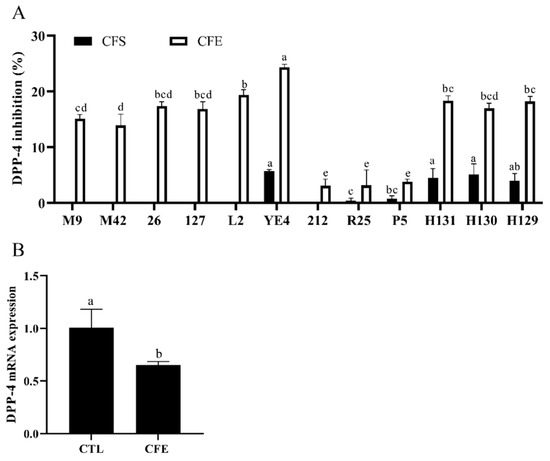 (A) Effects of different lactic acid bacteria (LAB) strains on the DPP-4 inhibitory activity in Caco-2 cells. CFS, cell-free excretory supernatants; CFE, cell-free extracts. (p < 0.05). (B) Effects of YE4-CFE on the mRNA expression of DPP-4 in Caco-2 cells. CFE, treatment group after YE4-CFE interacted with Caco-2 cells; CTL, control group. Each value represents the mean ± standard deviation (n = 3). Different letters (a–e) on the column with the same color indicate significant differences (p < 0.05).