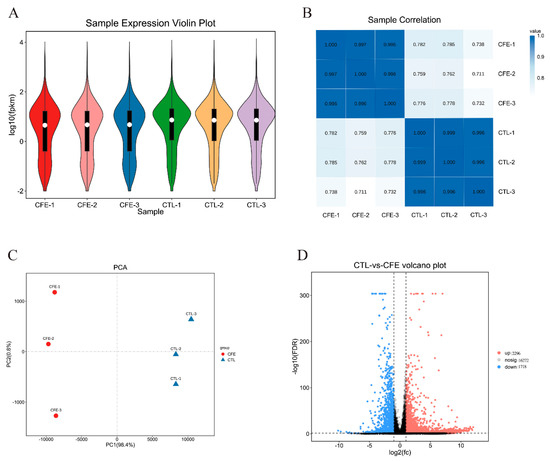 Effects of the cell−free extracts (CFEs) collected from L. plantarum YE4 (YE4−CFE) on the global gene expression profiling in Caco−2 cells. (A) Violin plot. The white dot in the plot represents the median, and the black rectangle is the range from the lower quartile to the upper quartile. The black line running through the violin represents the minimum non−abnormal value to the maximum non-abnormal value. (B) Sample correlation heat map. The value in each small box is the Pearson correlation coefficient (R). (C) Principal component analysis (PCA). PC1 represents the first principal component and PC2 represents the second principal component. (D) Volcano map. The red dots indicate the upregulated differentially expressed genes (DEGs). The blue dots indicate the downregulated DEGs. However, there is no significant difference in the expression of the genes in black. DEGs were estimated by FDR < 0.05 and |log2(FC)| > 1. CFE, treatment group after YE4−CFE interacted with Caco−2 cells; CTL, control group.