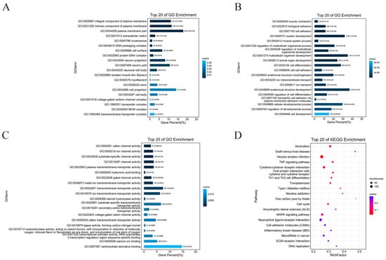 Gene ontology (GO) is known as a standardized gene function category database that provides a system for hierarchically classifying genes or their products into terms, organized in a graph structure, in any organism [23]. In this study, we observed 60 significantly enriched subcategories in DEGs to the GO databases (FDR < 0.05). Among the DEGs in the CTL and CFE groups, the significant functional differences in the cell component (CC) enrichment were as follows: integral component of the plasma membrane, intrinsic component of the plasma membrane, the plasma membrane part, etc. (Figure 4A). The marked functional differences in biological process (BP) enrichment were the following: muscle contraction, biological adhesion, cell adhesion, etc. (Figure 4B). In addition, the prominent functional differences in molecular functions (MF) enrichment were as follows: cation channel activity, ion channel activity, substrate-specific channel activity, etc. (Figure 4C).