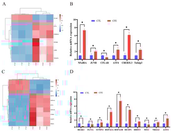 According to the results of the RNA-seq analysis shown in Figure 5A, compared with the CTL group, the CFLAR gene of the TNF signaling pathway was markedly downregulated, while other TNF signaling pathway genes, namely ATF4, CREB3L3, NFκBIA, JUNB, and Tnfaip3, were notably upregulated (p < 0.05). The mRNA expression of the same genes above was measured by qRT-PCR analysis. As shown in Figure 5B, the results revealed that the upward and downward trends of these genes were consistent with the RNA-Seq analysis results. The mRNA expression of NFκBIA was increased the most, by 7.32-fold, followed by those of CREB3L3, ATF4, Tnfaip3, and JUNB, by 6.1-, 2.46-, 2.43-, and 1.98-fold respectively, while the mRNA expression of CFLAR was downregulated by 0.53-fold relative to that in the CTL group (p < 0.05).