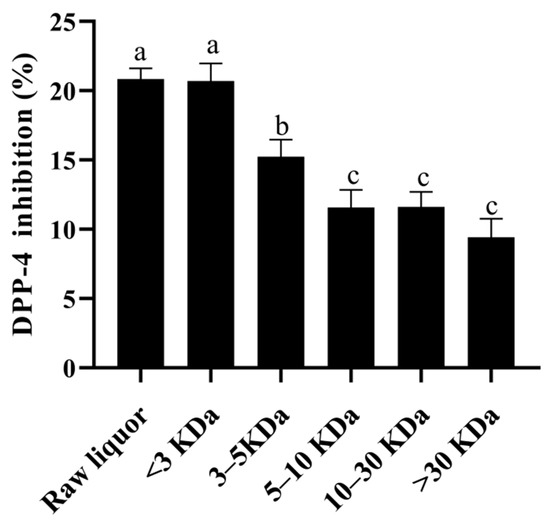 Effects of the cell-free extracts (CFEs) collected from L. plantarum YE4 (YE4-CFE) with different molecular weight components on the inhibitory activity of DPP-4. CFEs, cell-free extracts; YE4-CFE, the CFE of L. plantarum YE4. Each value represents the mean ± standard deviation (n = 3). Different letters (a–c) indicate significant differences (p < 0.05).