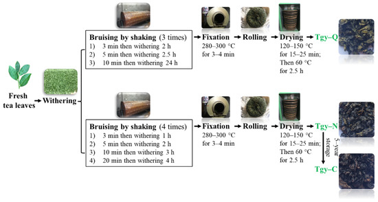 Tgy-Q, Tgy-N, and Tgy-C prepared by identical raw materials were manufactured by Fujian Anxi Qishan Weiyin Famous Tea Co., Ltd., and kindly provided by Mr. Yuede Wei, who oversaw the manufacturing processes of the experimental tea products for this study. Brief processing of these three products was as following: the raw leaves (one bud and three or four leaves) for making these three types of Tieguanyin tea were hand-picked from cultivated Tieguanyin cultivar at the end of September. The authenticity of Tieguanyin cultivar was verified by professor Jiangfan Yang. The leaves then underwent withering, shaking, fixation, rolling, and drying. The major difference for these three types of Tieguanyin products are driven by the shaking step and the following storage. Detailed manufacturing processes of these three products was shown in Figure 1. Standard catechins (–)-gallocatechin (GC), (–)-epigallocatechin (EGC), (+)-catechin (C), (–)-epigallocatechin-3-gallate (EGCG), (–)catechin gallate (CG), (–)gallocatechin gallate (GCG), (–)epicatechin (EC), (–)epicatechin gallate (ECG), gallic acid (GA), and Caffeine were purchased from Sigma-Aldrich (St. Louis, MO, USA).