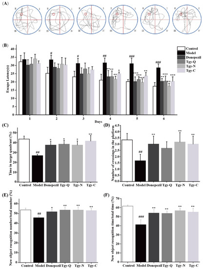 Figure 2. Tieguanyin extracts improve the cognitive ability. (A) Trajectory map of Morris maze in six groups of mice, the area of water maze circular pool was divided into four quadrants I, II, III, and IV, the target object was located in II area. (B) Escape latency of looking for invisible platform in six groups of mice. (C,D) Remaining time of target area and number of crossings in six groups of mice. (E,F) Effect of Tieguanyin extracts on APP/PS1 mice in new object recognition experiment. Donepezil group indicates positive control group (n = 8, APP/PS1 mice), daily delivered with 1 mg/kg/day Donepezil in 0.25 mL Sterile by oral gavage for 70 days; Control group (n = 10, C57BL/6 J mice), Model, Tgy-Q, Tgy-N, Tgy-C groups each has 8 APP/PS1 mice, which was administrated with corresponding sterile water or different extracts dissolved in 0.25 mL sterile water by daily oral gavage for 70 days. Data are mean ± SEM. # p < 0.05, ## p < 0.01, and ### p < 0.001 different from control group, * p < 0.05, ** p < 0.01, and *** p < 0.001 different from model group.