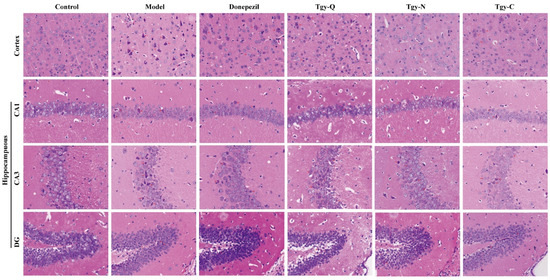 From the above behavioral results, we found that the three Tieguanyin extracts significantly improved cognition, learning, and memory abilities of APP/PS1 mice, suggesting that it may work by improving the pathological state of the mouse brain. To confirm this hypothesis, we first observed its effect on brain tissue by H&E staining. The results show (Figure 3) that the cortex and hippocampus (CA1, CA3, DG) of the normal group of mice have uniform staining of nerve cells, normal structure, neatly arranged, and large numbers of neurons, round nuclei, obvious nucleoli, cell membranes, and nuclei. The cortex and hippocampus of the model group mice showed abnormal tissue structure, cell morphology changes, and most neurons showed pyknotic nuclei, deep staining of cytoplasm, and unclear boundaries between cell and nuclear. The number of neurons in the cortex and hippocampus of the Donepezil group mice was relatively large. The morphology was improved, the nucleus was round, and the nucleolus was obvious. The neurons in the cortex and hippocampus of the mice in the Tgy-Q group were fairly neatly arranged, and part of the nucleus was abnormally stained. The number of neurons in the cortex and hippocampus of the Tgy-N group of mice was large and neatly arranged. The neurons were large, the cell membrane was clear, the nucleus was round, and the nucleoli were obvious. The cortex and hippocampus of the mice in the Tgy-C group are arranged neatly, with round nuclei and obvious nucleoli. Occasionally, the nuclei are concentrated and deeply stained, and the cell morphology changes. Compared with the model group, the pathological conditions of the three Tieguanyin extracts groups are all improved.