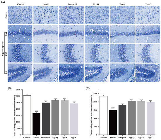 Nissl body, as a neuron’s marker substance, its morphology and structure can reflect the neuron’s morphology and function. As shown in Figure 4A, the neurons in the cortex and hippocampus (CA1, CA3, DG) of the control group mice are arranged neatly, the cell structure is complete and uniform, the number of neurons is large, the number of Nissl bodies is large, and the morphology is normal. Compared with the normal group, the cells in the cortex and hippocampus of the model group were scattered, the number of Nissl bodies was significantly reduced (p < 0.001), or even disappeared, the staining became lighter, the cell morphology changed. Compared with the model group, the cells in the cortex and hippocampus of the Donepezil group are more evenly arranged, the cytoplasm is darker, the number of Nissl bodies is significantly increased (p < 0.001), and the cell morphology is abnormal occasionally. Compared with the model group, the cells in the cortex and hippocampus of the Tgy-Q group were neatly arranged, the number of Nissl bodies was significantly increased (p < 0.001), the cytoplasmic staining was deeper, and abnormal cell morphology was occasionally observed. The cells in the cortex and hippocampus of the Tgy-N group were arranged neatly, the number of Nissl bodies increased significantly (p < 0.001), the cytoplasm was stained darker, and some cells were abnormal. The cells in the cortex and hippocampus of the Tgy-C group were neatly arranged, the number of Nissl bodies increased significantly (p < 0.001), and some cells were abnormal in morphology. The pathological conditions of the three Tieguanyin extracts groups were improved, and the Tgy-Q group was the weakest (Figure 4B,C).