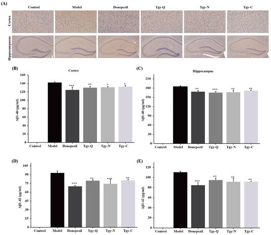 Figure 5. The effects of Tieguanyin tea extracts on expression of Aβ (1-42) in the brain of APP/PS1 transgenic mice by immunohistochemical staining. (A) Cortex (×200), Hippocampus (×100). n = 3 for each group. (B,C) Aβ1-40 and (D,E) Aβ-42 levels in the cortex and hippocampus in APP/PS1 mice (n = 5 for each group; control group was not detected, n = 7). * p < 0.05, ** p < 0.01 and *** p < 0.001 different from model group.