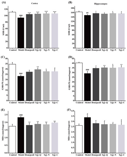 Aβ causes oxidative stress hierarchical reactions, these reactions are also positively related to the synthesis and deposition of Aβ We further tested the effect of Tieguanyin extracts on oxidative stress in the cerebral cortex and hippocampus of APP/PS1 mice, and found that compared with the blank group, the MDA level in the cortex of the model group had significantly increased, and the SOD activity and GSH-Px levels had decreased significantly. Compared with the model group, the MDA level in the mouse cortex of the Donepezil group was significantly reduced, and the SOD activity and GSH-Px level were significantly increased; while the MDA level in the cortex of mice in the Tgy-Q, Tgy-N, and Tgy-C groups was significantly reduced, SOD activity and GSH-Px levels were significantly increased (Figure 6A,C,E). Similar results were observed in the hippocampus (Figure 6B,D,F). The above results demonstrate that Tieguanyin extracts can significantly reduce the level of oxidative stress in the cerebral cortex and hippocampus of APP/PS1 mice.