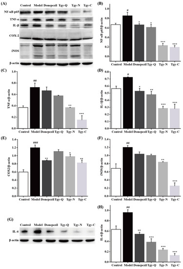 As an inflammatory stimulating factor, Aβ can stimulate the activation of cells and cause the release of inflammatory factors [13,14]. In addition, neuroinflammation is accompanied by the entire process of AD occurrence and development. Abnormally activated microglia and a large amount of inflammatory factors can jointly trigger neuroinflammation in experimental animals [14,15]. In our study, as shown in Figure 7, we found that compared with the blank group, the protein levels of NF-κB p65, TNF-α, IL-1β, and IL-6 in the brain tissue of the model group increased significantly. Compared with the model group, the levels of NF-κB, IL-1β, and IL-6 in the Donepezil group decreased significantly, and there was no significant performance difference in TNF-α. The levels of NF-κB, IL-1β, and IL-6 in the Tgy-Q group decreased significantly, but there was no significant difference in TNF-α, NF-κB, TNF-α, IL-1β, and IL-6 in the Tgy-N, and the Tgy-C groups decreased significantly. Compared with the control group, the COX-2 and iNOS protein levels in the brain tissue of the model group increased significantly, and compared with the model group, there was no significant difference in COX-2 and iNOS in the Tgy-Q group, and IL-6 was significantly reduced, while the COX-2, iNOS, and IL-6 in the Tgy-N and Tgy-C groups were significantly reduced. The above results demonstrated that Tieguanyin extracts could significantly down-regulate the expression of inflammatory related proteins in brain, and finally alleviate the AD syndromes in APP/PS1 mice.