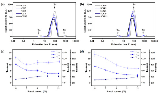 The results of LF-NMR can effectively determine water mobility and distribution in gel matrix [27]. T2b (1–20 ms), T21 (20–300 ms), and T22 (400–2000 ms) represented the transverse relaxation time of bound water, immobilized water, and free water (Figure 1a, b), respectively. It was obvious the relaxation time of different water migrated. As shown in Figure 1c, d, the peak relaxation time of bound water (TP2b) in gels without starch was 2.39 ms (CG) and 1.94 ms (SCG), between which there was a significant difference (p < 0.05) that might be related to the gel structure heated by dissimilar processes. TP2b increased by starch addition and showed a positive correlation with starch content. The migration of TP2b was relevant to different water mobility bound by the protein and starch. The peak relaxation time of immobile water (TP21) dropped from 101.71 ms to 71.71 ms in CG, and from 94.84 ms to 65.36 ms in SCG. The shorter the relaxation time (T2), the stronger the binding force of water molecules to matrix [12]. Thus, the water mobility of bound water significantly increased with starch incorporation (p < 0.05), while the mobility of non-mobile and free water decreased in both matrices. This was consistent with the investigation by Li et al. [28], who found that starch showed a better restriction capacity on the free motion of water molecules. However, the relaxation time between the two types of gels had a significant difference (p < 0.05), indicating that starch-swelling differed in gel matrices with different heating treatments.