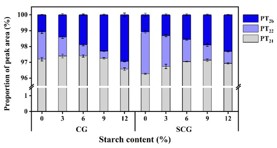 The relative moisture content was observed by peak area proportions (PT2b, PT21, and PT22) in Figure 2. It was discovered that immobile water made up the majority of the primary proportion in surimi gel, followed by bound water and free water. PT21 showed the relative content of immobile water that increased initially with the addition of starch, resulting in a reduction in free water in both CG and SCG. The PT21 of CG and SCG reached a maximum at 6% and 9% starch content, respectively. Subsequently, it decreased and was possibly associated with the dehydration of surimi gels suffered by the compression from starch swelling. Moreover, starch incorporation reduced the relative surimi content in the entire matrix, causing a decrease in immobile water content held by surimi gel network. Notably, in the non-starch containing gels, PT21 of CG and SCG was 97.20% and 96.27%, showing that the gel matrix had higher PT21 without preincubation at 40 °C. The changes might presumably contribute to overheated time and the squeeze by gel formation in SCG, resulting in a transition from immobile water to free water. Although direct heating formed a poor gel, the juiciness mouthfeel of surimi products improved [29]. Since the hydroxyl groups in starch bound more water, the matrix with starch incorporation significantly differed in PT22 (p < 0.05). However, PT2b significantly increased with the continuous addition of starch (p < 0.05), especially in CG. With 12% starch, PT2b of CG increased by 173.15% compared to 113.89% in SCG. Among the above changes, it indicated that water absorbed by starch existed in the form of immobile water and bound water. Moreover, it was inferred that the starch in direct cooking gels showed better swelling states, which resulted in the phenomena where the internal starch structure tended to easily combine with water.