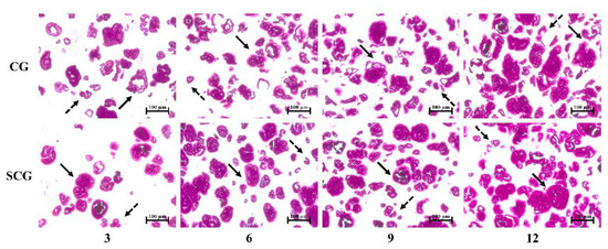 Overall microstructures of starch–surimi gels were observed at 300× to reflect the morphology of starch and surimi matrix after cooking (Figure 4). The gelatinization temperature of potato starch ranged from 56 to 66 °C, and the amorphous region extended after reaching this temperature range [30]. For CG, as the temperature rose above 45–50 °C, the suwari was partially disrupted, resulting in modori formation and unhindered starch swelling [31]. Moreover, the loose gel network might be a key factor of the irregular swelling of starch. In contrast with non-setting gels, SCG showed more substantial resistance to starch swelling that avoided water loss in the gel network structure. It might contribute to the setting step, which resulted in the formation of a stable surimi gel network in SCG. Thus, it could be determined that the setting effect promoted cross-linking in surimi, hindered water absorption, and broke hydrogen bonds in the striations of starch granules.