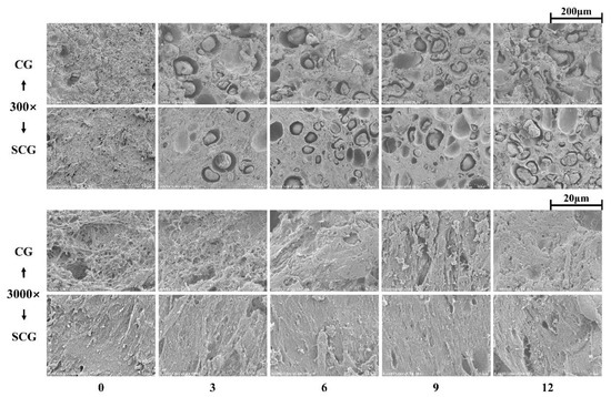 Viewed at large magnifications, non-starch containing CG exhibited a coarse matrix with large cavities, as shown in Figure 4. However, the addition of the starch made cavities disappear, resulting in more compact surimi. According to the results from Kong et al. [16], these shrunk surimi networks were considered to be responsible for the “packing effect.” Meanwhile, for SCG, no significant changes were observed, and smooth structures were shown throughout the addition of starch.