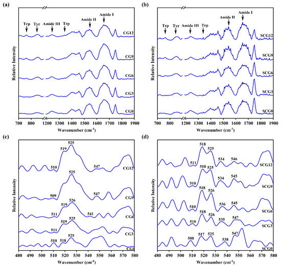 The vibrations near 760 and 1340 cm−1 present the microenvironment of Trp residues. Once the Trp residues buried in the hydrophobic environment were exposed to a polar environment, the intensity of bands showed upward trends [41]. The intensity of tryptophan residue bands increased slightly with the increment of starch content in Figure 4 possibly contributing to the exposure of Trp residues [42]. The starch granules occupied the matrix space, which promoted the unfolding of protein structure and then provided impetus to the exposure of the hydrophobic core. A similar result was found in the Tyr doublet bands, which were proposed as a means for determining whether the tyrosine residue was solvent-exposed or buried [43]. If the intensity at 850 cm−1 (I850) was higher than I830, this indicated that the Tyr residues at this time changed from the “buried” to the “exposed” state [44]. The distinct vibrations were exhibited differently at 830 and 850 cm−1 in both gels (Figure 5a, b). A decreased I830 and a concurrent increased I850 indicated that there were weak hydrophobic interactions among tyrosine residues. It could be demonstrated that protein solubility of CG increased due to reduced hydrophobic interactions. However, the change of hydrophobic amino acids between CG and SCG was not obvious. Therefore, the setting treatment of surimi did not hinder the effect of starch addition on the spatial structure of hydrophobic amino acids in surimi proteins.