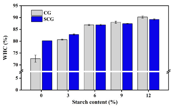 WHC represents the stability of the mixed matrix suffering external forces, which indirectly reflects the compactness of surimi gels and water absorption capacity of starch [50]. As shown in Figure 6, the gel matrix presented a significant increase in WHC accompanied by adding starch in both heating processes (p < 0.05). This was in line with previous research by Mi et al. [17] and Luo et al. [14]. It has been revealed that starch had strong hydrophilicity and showed an effective swelling effect with larger particles, which increases the WHC of the gel matrix. The setting effect promoted the formation of the myofibrillar protein network, which could also reduce water loss caused by an external force, thereby increasing WHC. The matrix treated by direct heating showed better WHC with a continuous increase in starch content. It was related to the irregular expansion of starch confirmed by the microstructure (Figure 4). In addition, WHC was markedly correlated with the variations in peak area proportion and peak relaxation time [51]. Some possible assumptions could be introduced to describe the changes of WHC: (i) the increase in WHC was associated with the migration of free water by adding starch; (ii) starch showed better swelling states in CG on account of the higher TP2b and lower TP22; and (iii) the setting effect improved the stability of immobile water, whereas it limited starch swelling.
