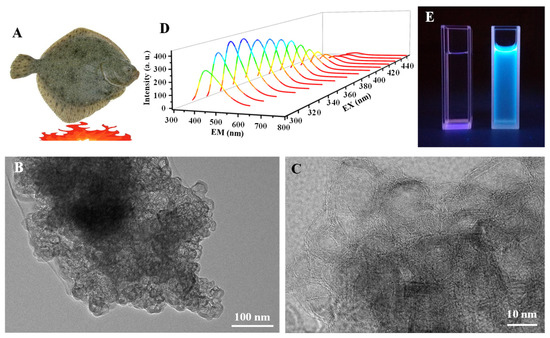 (A) Scheme illustration of grilled turbot at 230 °C. TEM images of (B) onion-like carbon particles (OCNPs) and the enlarged TEM image (C) of OCNPs derived from grilled turbot, (D) fluorescence spectra and (E) fluorescence photograph of the OCNPs (right) using water (left) as a control.