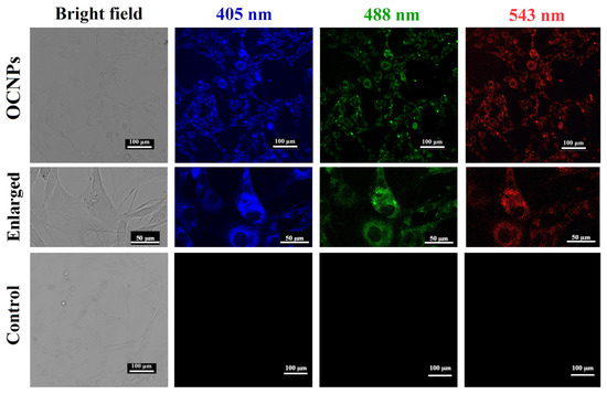 Previous studies implied that carbonate NPs, including carbon dots and carbon nanotubes, could be use as biocompatible nanoprobes since they can be absorbed by cells in vitro [25,26]. For this reason, the bio-distribution and cytotoxicity of OCNPs from grilled turbot were investigated in living cells. Given that the MC3T3-E1 cells showed no fluorescence under a laser scanning confocal microscope (Figure 2), the location of OCNPs can be tracked if OCNPs enter the cells due to their unique fluorescence property. The fluorescence of MC3T3-E1 cells indicated that OCNPs penetrated the MC3T3-E1 cell membrane and distributed evenly in the cytoplasm (enlarged images in Figure 2). However, due to the surface chemistry compared to other foodborne nanoparticles reported, aside from the slightly weak dispersibility, the OCNPs were blocked outside of the nucleus. In contrast to the control group, no cellular morphology change derived from OCPNs’ entry was observed. Meanwhile, blue, green, and red fluorescence of OCPNs could be observed in the MC3T3-E1 cells by different excitation wavelength of 405, 488, and 543 nm, respectively, which was consistent with the excitation-dependent fluorescence behavior of carbonate NPs [27]. Therefore, the internalization of OCNPs into the living cells indicated that the bio-influence of the nanostructure could not be ignored, and further study should be carried out in understanding their interaction and nanoimpact on organisms.