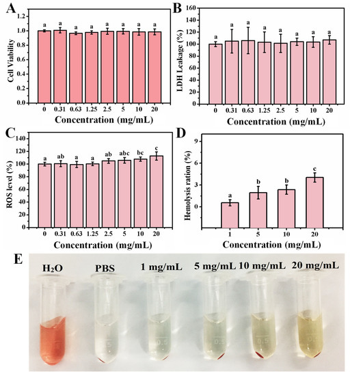 (A) Relative cell viability of MC3T3-E1 cell, (B) relative LDH release level of MC3T3-E1 cell, (C) relative ROS values of MC3T3-E1 cell after incubation with different concentrations OCNPs from the grilled turbot for 24 h. (D) Hemolysis ratio of red blood cells, (E) changes of red blood cells after incubation with different concentrations OCNPs for 1 h. Different letters above columns indicate significant differences (p < 0.05) between treatments.