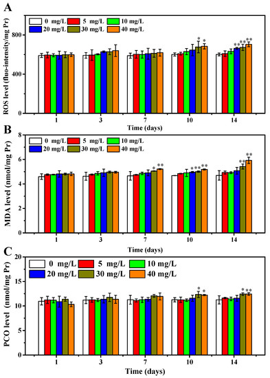 In addition, as products of the lipid and protein oxidation process, the MDA and PCO levels in zebrafish body were investigated to evaluate oxidative damage of the OCNPs [33,34]. As shown in Figure 5B, the MDA concentration of zebrafish did not show a significant difference after 3 days of exposure (p > 0.05). After 7 days, the 30 mg/L group and the 40 mg/L group showed a significant difference (p < 0.05) and remarkable difference (p < 0.01), respectively. After 10 days treatment, the MDA concentration in the 20 mg/L group also increased significantly (p < 0.05), while MDA concentration in the 30 mg/L group and the 40 mg/L group increased remarkably (p < 0.01) and the increase trend continued to 14 days. Excessive ROS is suggested to cause lipid peroxidation, leading to damaging the normal structure of the cell membrane and intracellular fluid leak, then inducing organism damage and finally disease or death. Therefore, it was revealed that OCNPs caused substantial generation of ROS and lipid peroxidation inside the zebrafish body, and the increment of MDA content due to lipid peroxidation has a toxic effect to zebrafish.