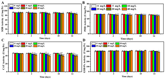 At present, the hypothesis on the toxicity mechanism of NPs is mostly focused on the speculation that NPs disorder the ROS level in organisms, then cause oxidative damage to lipids and proteins and eventually induce harmful disease. According to the results from the acute toxicity test, the zebrafish were cultured with OCNPs at concentrations of 0, 5, 10, 20, 30, and 40 mg/L, and randomly tested at 1, 3, 7, 10, and 14 days. ROS level and biomarkers related to oxidative stress of test zebrafish were investigated to evaluate subacute toxicity of OCNPs. As shown in Figure 5A, the ROS level of the zebrafish body did not show a significant difference compared with the control group (p > 0.05) in the 5, 10 mg/L group from 1 to 14 days and in the 20 mg/L group from 1 to 10 days after exposure. However, the ROS level of the 20 mg/L group increased significantly after 14 days (p < 0.05). When the concentration of OCNPs increased to 30 mg/L and 40 mg/L, the ROS level remained constant for 7 days (p > 0.05), increased significantly after 10 days (p < 0.05), and increased remarkably after 14 days (p < 0.01). It is obvious that the impact of OCNPs on ROS level in zebrafish body intensified along with the increase of OCNPs concentration and exposure time.