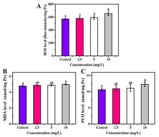(A) ROS, (B) MDA, and (C) PCO level of zebrafish after exposure to OCNPs in chronic toxicity test. Different letters above columns indicate significant differences (p < 0.05) between treatments.