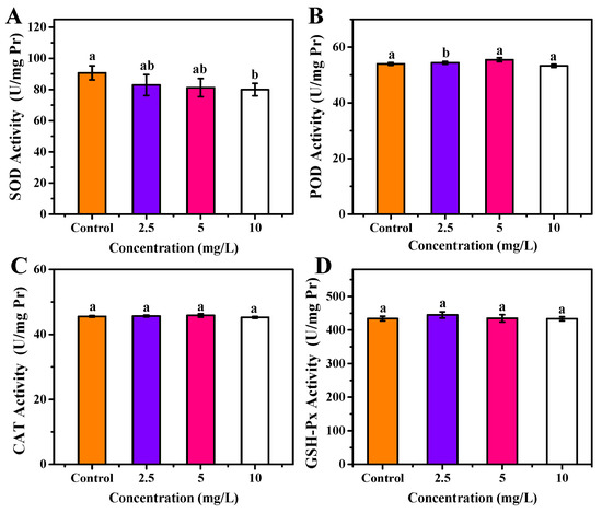 (A) SOD activity, (B) POD activity, (C) CAT activity, (D) GSH-Px activity of zebrafish after exposure to OCNPs in chronic toxicity test. Different letters above columns indicate significant differences (p < 0.05) between treatments.