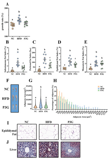P3G supplementation reduced weight gain and fat accumulation in HFD-induced mice. Mice induced by high-fat diet were treated with P3G (100 mg/day/body weight) for 12 weeks (n = 6–8 in each group): (A) growth rate within 12 weeks; (B) subcutaneous fat index; (C) perirenal fat index; (D) epididymal fat index; (E) mesenteric fat index; (F) adipose tissue; (G,H) epididymal adipocyte size (adipocyte size was estimated using ImageJ software); (I) hematoxylin and eosin (H&E)-stained epididymal adipose tissue (scale bar, 100 μm); (J) representative pictures of Oil Red O-stained liver tissue (scale bar, 100 μm). Data are expressed as mean ± standard error (mean ± SEM) and analyzed using one-way analysis of variance (ANOVA); a, b, and c represent significant differences between groups. The same letter indicates no significance between the two groups, and different letters indicate significance (p < 0.05).