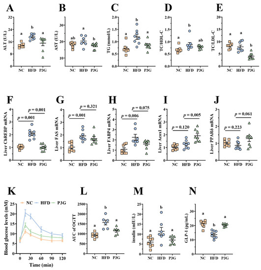P3G supplementation alleviated HFD-induced glycolipids metabolism disruption in mice. (A) ALT, (B) AST, (C) TG, (D) TC/HDL-C, and (E) TC/DLD-C levels in plasma. (F–J) ChREBP, FAS, FABP4, Acox1, and PPARδ mRNA levels in liver, respectively. (K) Blood glucose and (L) area under the curve (AUC). (M) Plasma insulin level. (N) Plasma GLP-1. Data are expressed as mean ± standard error (mean ± SEM) and analyzed using one-way analysis of variance (ANOVA); a and b represent significant differences between groups. The same letter indicates no significance between the two groups, and different letters indicate significance (p < 0.05).