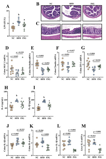 3.3. P3G Supplementation Maintained the Integrity of the Intestinal Barrier and Relieved Inflammation in HFD-Fed Mice