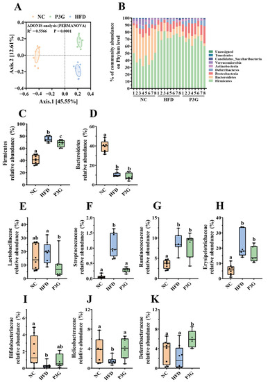 P3G supplementation regulated gut microbial community. (A) PCoA of gut microbiota based on the ASV data of the NC, HFD, and P3G groups. (B) Bacterial taxonomic profiling at the phylum level of intestinal bacteria from different groups. (C,D) The relative abundance of Firmicutes and Bacteroidetes. (E–H) Four groups of bacterial families with significantly reduced relative abundance in the P3G group compared to the HFD group. (I–K) Three groups of bacterial families with significantly increased relative abundance in the P3G group compared to the HFD group. Box-and-whisker plots are used to represent the data, and one-way analysis of variance (ANOVA) was used to evaluate the data; a, b, and c represent significant differences between groups. The same letter indicates no significance between the two groups, and different letters indicate significance (p < 0.05).