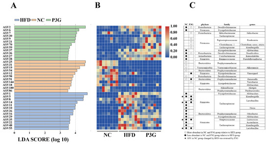 (A) LEfSe and (B) heatmap showing the most significantly different abundant taxa enriched in the microbiota from the three groups. Only the taxa with an LDA score higher than 3.5 are shown. (C) The circles (○) and dots (●) represent the significantly higher and lower relative abundances of ASVs in the NC or P3G group compared to the HFD group, respectively. The star (★) shows that P3G treatment restored ASV in the NC group caused by HFD intervention. The phylum, family, and genus names of ASVs are also displayed.