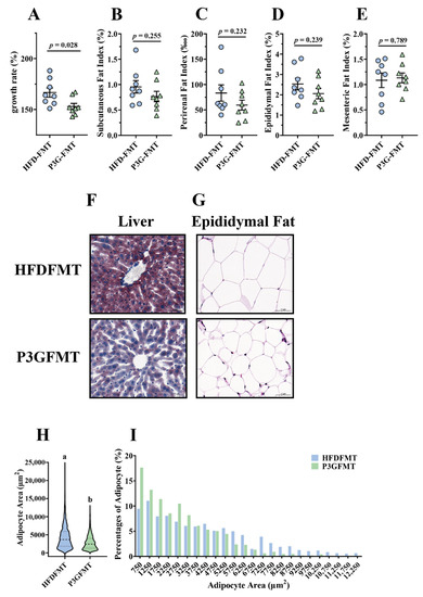 To confirm whether the P3G-induced intestinal microbial shift was involved in the improvement in obesity, a fecal microbiota transplantation (FMT) experiment was performed in HFD-fed mice for 12 weeks (Figure S5A). The body weight gain of the mice in the P3G-FMT group was lower than that of the HFD-FMT group (Figure 6A). In addition, the mice that received microbiota from P3G group exhibited lower fat content, liver fat accumulation, and fat cell size compared to the mice that received microbiota from HFD group (Figure 6B–I). Moreover, the concentration of AST in the plasma of the P3G-FMT group was lower compared to that of the HFD-FMT group, although no significant changes were observed in the levels of ALT and TG (Figure S5B–D). Additionally, mice in the P3G-FMT group showed robust improvement in glucose tolerance relative to mice in the HFD-FMT group (Figure S5E,F). Additionally, compared to the HFD-FMT group, the insulin level was lower in the P3G-FMT group, but there was no statistical difference (Figure S5G). In summary, these findings showed that the impact of P3G on HFD-induced obesity was partly mediated by the gut microbiota.