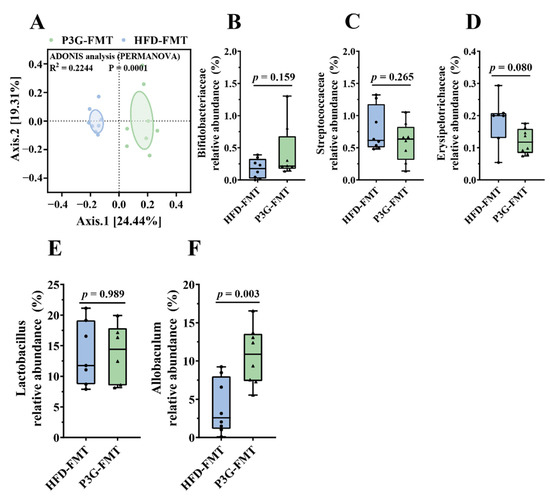 Although the findings showed that P3G might modify the structure and composition of the gut microbiota in the HFD-fed mice, it remains to be determined whether the improved obesity phenotype of mice is dependent on the gut microbiota’s modulating effects. In recent years, FMT, transferring the intestinal bacteria of donor mice into recipient mice by oral gavage, has been considered a promising method for proving the cause-and-effect connection between gut microbiota and obesity [67,68]. Therefore, FMT was utilized to examine the role of P3G-induced gut microbiota in the protection against HFD-induced obesity. In the current experiment, no statistically significant difference in fat mass was observed following P3G-FMT treatment compared to HFD-FMT treatment (Figure 6B–E), whereas P3G-FMT treatment reduced hepatic lipid deposition and adipocyte size (Figure 6G–I). The oral glucose tolerance was also improved (Figure S5E,F), demonstrating that the antiobesity effect of P3G might be partly mediated by intestinal bacteria. Furthermore, the results of 16S rRNA sequencing indicated that the microbial composition of the HFD-FMT group was comparable to that of the HFD group, whereas the microbial composition of the P3G-FMT group was distinct from that of the HFD group but similar to that of the P3G group (Figure S6C). The relative abundance of Bifidobacteriaceae was increased by P3G-FMT treatment, and the relative abundances of Streptococcaceae and Erysipelotrichaceae were decreased by P3G-FMT treatment (Figure 7B–D). Moreover, P3G-FMT treatment resulted in an increase in the Allobaculum genus (Figure 7F), which is negatively correlated with obesity [69]. Based on those results, only a slight improvement in lipid between the two groups was found. This may be caused by the perturbation of the initial conditions of the microbiome (such as routine and sterile). Transplanting the gut microbiota to germ-free mice will provide more convincing support of this finding.