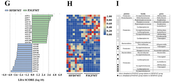 Fecal transplantation modulated the composition of intestinal microbiota. (A) PCoA of gut microbiota based on the ASV data of the HFDFMT and P3GFMT groups. (B–D) The relative abundance of bacterial families were different in the P3GFMT group compared to the HFDFMT group. (E,F) The relative abundance of bacterial genus were different in the P3GFMT group compared to the HFDFMT group. (G–I) LEfSe and heatmap showing the most significantly different abundant taxa enriched in the microbiota from the HFDFMT and P3GFMT groups. Only the taxa with an LDA score higher than 3.5 are shown. The circles (○) and dots (●) represent the significantly higher and lower relative abundances of ASVs in the P3GFMT group compared to the HFDFMT group, respectively. The phylum, family, and genus names of ASVs are also displayed. Box-and-whisker plots are used to represent the data, and the two-tailed Student’s t-test was used to evaluate the data.