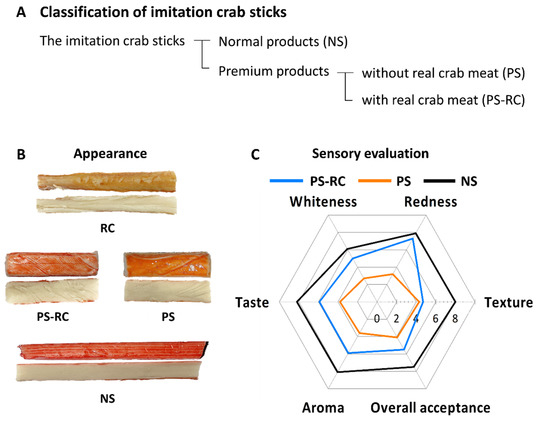 Mun, S.; Shin, E.-C.; Kim, S.; Park, J.; Jeong, C.; Boo, C.-G.; Yu, D.; Sim, J.-H.; Ji, C.-I.; Nam, T.-J.; et al. Comparison of Imitation Crab Sticks with Real Snow Crab (Chionoecetes opilio) Leg Meat Based on Physicochemical and Sensory Characteristics. Foods 2022, 11, 1381. https://doi.org/10.3390/foods11101381