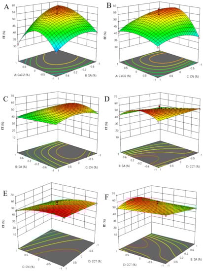 Response surface of the effects among various factors on the encapsulation efficiency of beads. (A) Interaction of CaCl2 and SA; (B) Interaction of CaCl2 and CN; (C) Interaction of SA and CN; (D) Interaction of SA and CCT; (E) Interaction of CN and CCT; (F) Interaction CCT and SA. SA: sodium alginate, CN: cellulose nanofibers, CCT: carboxymethyl chitosan, EE: encapsulation efficiency.