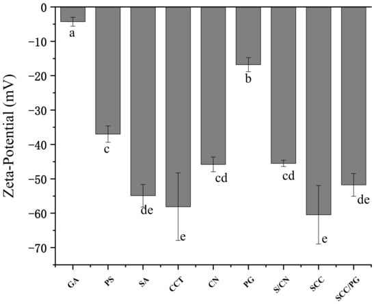 As one of the important indications of charged polymers, zeta-potential reflects the interpenetration of the biopolymers, and the charged nature is the most significant [26,27]. The zeta-potentials of GA, PS, PG, SA, CN, CCT, and other polysaccharides are shown in Figure 2. When dissolved in water, GA was negatively charged and had a zeta-potential of −4.3 mV. After encapsulation with PS, GA was stabilized (a lower zeta-potential of PG). Though the zeta-potential of PG was higher than that of PS, the stability of PG still needs further improvement. The zeta-potential of SA, CN, and CCT was −54.9, −45.8, and −58.1 mV, respectively, and that of the physical mixture of SA and CN (SCN) was −45.5 mV, slightly higher than any single polysaccharide solution. After the addition of CCT and physical interpenetrating process, the zeta-potential of SCN decreased to −60.43 mV, revealing that the SCC system was extremely stable. The zeta-potential of SCC/PG system was increased slightly to −51.73 mV. The behavior of individual biopolymers is influenced by the presence of other biopolymers in solution once they are mixed and interpenetrated, as mutual masking of surface charges might occur among the multiple polymer solutions [28]. The results of zeta-potential analyses showed that the SCC could effectively provide protection for GA and ensure the stability of the system. Meanwhile, the coating layer provided by SCC and PS could guarantee the bioavailability of GA to some extent when GA suffers from extreme pH and peristalsis of gastrointestinal environment.