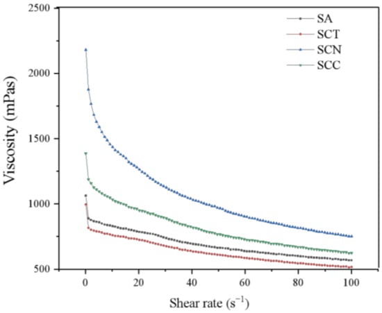 Flow curves of SA (sodium alginate), SCT (SA/CCT), SCN (SA/CN), and SCC (SA/CN/CCT) solutions.