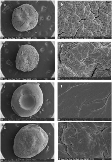 The morphology of lyophilized beads was observed by SEM (Figure 4). All kinds of dry beads have diameters in the range of 1300–1800 μm. During the dehydration, the beads formed irregular, uniform spheres with no aggregation, as the wall material shrank inward and collapsed partially. The surface texture of SA bead was rough, with some cracks and wrinkles (Figure 4a,b). The addition of CN narrowed the cracks and made the surface dense (Figure 4c,d). Images of the SCN and SCC beads showed that the beads did not shrink or swell with core-removal, likely due to the mechanical stability provided by the CN network [31]. The surface became smoother and denser by the addition of CCT (Figure 4a,e,g) with fewer cracks. Due to the polyhydroxy hydrophilic structure of CN, the pores and cracks on the bead surface did not improve after the beads had undergone the vacuum freeze-drying process; therefore, the SCT bead without CN showed a better performance in terms of surface density, and the same results were reported by Zhang et al. [32], who found the gel spheres would wrinkle with a higher CNF content. The sizes of beads were in the range of 1.5 ± 0.2 mm. The SCT bead was the largest, while the SCC bead and SCN bead were smaller, which indicated that the introduction of CN and CCT could enlarge the size of beads. This result was consistent with previous findings Shi et al. [33] and Li et al. [14]. Under 5000× magnification, it is clear that the addition of CCT formed a complete interpenetrating network, smoothing the originally SA surface (Figure 4b,f,h). These changes might result from the interactions between CCT chains and SA chains as well as the interactions between CCT chains and CN chains from interpenetrating and physical interweaving [22]. According to Shi et al. [33], the SA bead changed from a cracked, homogeneous structure to a core-layer and density model after blending with CCT. This effect was believed to play an important role in its release behavior.