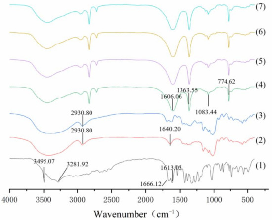 FT-IR spectra of (1) GA, (2) PS, (3) PG, (4) SA/PG beads, (5) SCN/PG beads, (6) SCT/PG beads, and (7) SCC/PG beads.