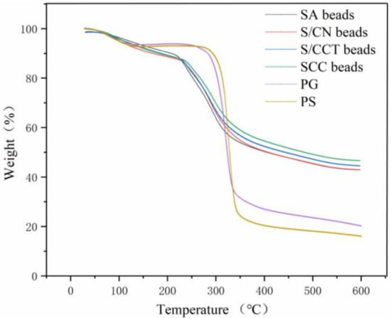 The thermogravimetric (TG) curves for the PS, PG powders, and four types of beads are displayed in Figure 6. Both PS and PG powders began to lose weight at about 100 °C, which was ascribed to the loss of bound water [36]. The cracking temperature of PG was approximately 300 °C, and the cracking process was not completed step by step, which might indicate that GA was adsorbed in the internal pores of PS. Additionally, the pyrolysis rate and the pyrolysis temperature of the PS obtained after the addition of GA was lower, which proved that GA entered the porous structure and interacted with starch through intermolecular forces. The weight losses of the four types of beads were observed in three degradation stages: (i) the mass of SA beads, S/CN beads, S/CCT beads, and SCC beads decreased from 50 °C to 230 °C by 13.3%, 13.2%, 12.8%, and 12.4%, respectively, as a result of water evaporation; (ii) from 230 °C to 330 °C, mass decreased by 43.7%, 41.9%, 40.2%, and 38.0%, respectively; and (iii) from 330 °C to 600 °C, mass decreased by 57.2%, 57.1%, 55.5%, and 53.3%, respectively. The last two stages corresponded to the release of additional water bound through polar interactions with the carboxylate, amine, and sulfate groups of SA, CNF, and CCT, respectively, as well as decomposition of the cyclic products and subsequent release of CO2 molecules from polysaccharides [22].